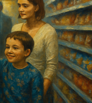 — Tudo bem, querido. Mete no cesto. A mãe precisa de ir ao corredor aqui ao lado. Já não temos massa. Queres esparguete ou fusilli?